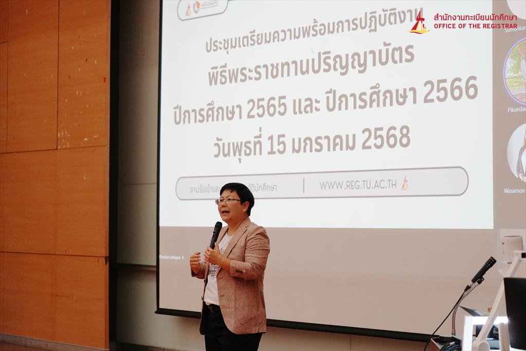 15 มกราคม 2568 สำนักงานทะเบียนนักศึกษา จัดการประชุมเตรียมความพร้อมพิธีพระราชทานปริญญาบัตร ประจำปีการศึกษา 2565-2566 ให้กับบุคลากรคณะ สถาบัน และวิทยาลัยต่าง ๆ ที่ปฏิบัติหน้าที่ดูแลบัณฑิตที่สำเร็จการศึกษาของมหาวิทยาลัยธรรมศาสตร์ โดยมี รองศาสตราจารย์ ดร.อรพรรณ คงมาลัย ผู้อำนวยการสำนักงานทะเบียนนักศึกษา และผู้ช่วยศาสตราจารย์ ดร.นพธนิษฐ์ โชติสาร รองผู้อำนวยการฝ่ายดิจิทัลและนวัตกรรมบริการ ร่วมชี้แจง ขั้นตอนการตรวจสอบรายชื่อบัณฑิตและวิธีการส่งรายชื่อบัณฑิตในพิธีซ้อมใหญ่และวันพิธีพระราชทานปริญญาบัตร ร่วมกับงานรับเข้าและทะเบียนประวัตินักศึกษา ผู้รับผิดชอบงานฝ่ายจัดเตรียมปริญญาบัตร ณ อาคารบรรยายรวม 1 (บร.1) มหาวิทยาลัยธรรมศาสตร์ ศูนย์รังสิต